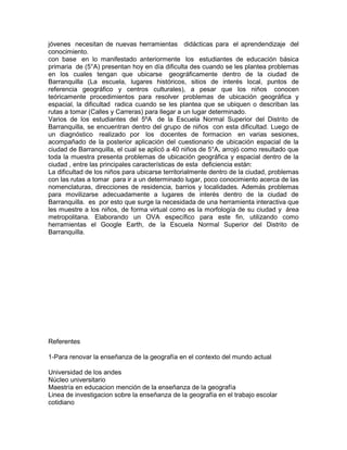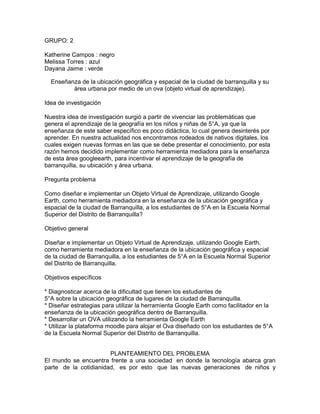 Este documento describe un proyecto de investigación que busca diseñar e implementar un Objeto Virtual de Aprendizaje (OVA) utilizando Google Earth para enseñar la ubicación geográfica y espacial de la ciudad de Barranquilla a estudiantes de 5° grado. El proyecto diagnosticó que los estudiantes tienen dificultades para ubicarse en la ciudad. El objetivo general es diseñar e implementar un OVA con Google Earth como herramienta para mejorar el aprendizaje de la geografía de Barranquilla.