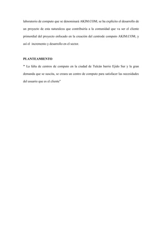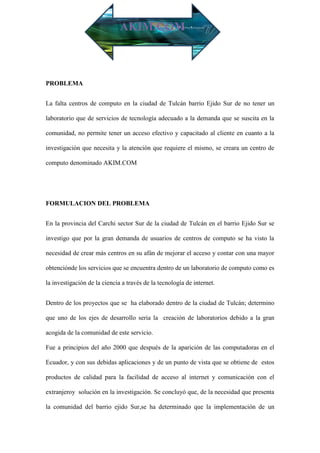 El documento describe la falta de centros de computo en el barrio Ejido Sur de la ciudad de Tulcán y la gran demanda de estos servicios por parte de la comunidad. Por esto, se propone crear un nuevo centro de computo llamado AKIM.COM para satisfacer las necesidades de investigación e información de los clientes.