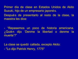 El primer día de clase de Akito Suzuki, un estudiante japonés, sorprende a sus compañeros y maestra al responder correctamente varias citas históricas estadounidenses. A medida que continúa respondiendo citas y frases famosas con precisión, incluso cuando sus compañeros se enojan y gritan insultos, la clase cae en un estado de histeria y la maestra se desmaya.