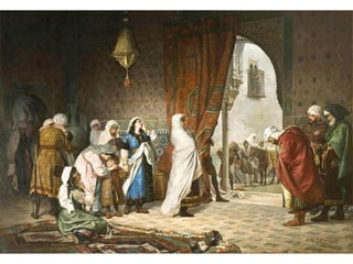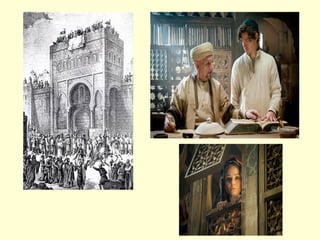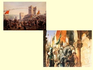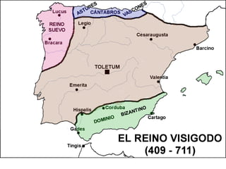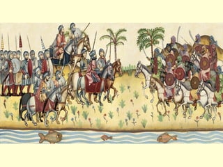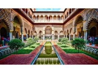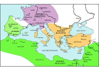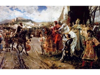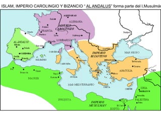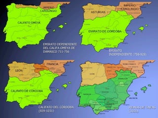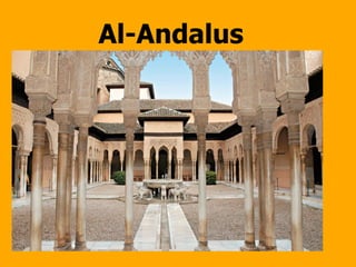 El documento describe la historia de Al-Andalus desde la conquista musulmana de la Península Ibérica en el siglo VIII hasta la caída del último reino musulmán de Granada en 1492. Los musulmanes establecieron un emirato independiente gobernado por Abderramán I y posteriormente un poderoso Califato de Córdoba bajo cuyo mandato alcanzó su máximo esplendor. Tras la desintegración del Califato en pequeños reinos taifas, los almorávides y luego los almohades unific