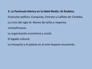 El documento resume la evolución política y socioeconómica de Al-Ándalus durante la Edad Media, incluyendo la conquista musulmana en el siglo VIII, el establecimiento del Emirato y Califato de Córdoba, la crisis del siglo XI que dio lugar a los reinos taifas y la influencia de los imperios norteafricanos, así como la organización económica basada en la agricultura, ganadería, artesanía y comercio. También destaca el legado cultural hispano-musulmán en arquitectura