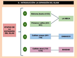El documento detalla la expansión del Islam desde la época de Mahoma hasta la caída del Reino Nazarí de Granada en 1492. Describe eventos clave como la conquista de la península ibérica, la formación del Emirato y posteriormente el Califato de Córdoba, y el impacto de los reinos de taifas y las dinastías almorávide y almohade. También se aborda la economía y sociedad de Al-Andalus, destacando sus sectores agrícolas, ganaderos y comerciales.