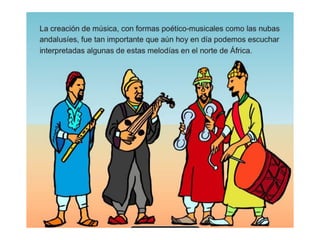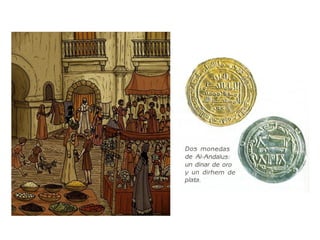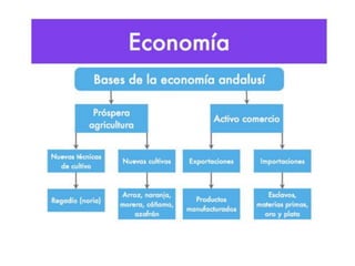 El documento describe el gran desarrollo económico, científico y cultural de Al-Andalus y su influencia en España. Los musulmanes introdujeron nuevas técnicas agrícolas que permitieron cultivar nuevos productos. También sobresalieron en matemáticas, astronomía, filosofía y otras ciencias, transmitiendo conocimientos a Europa. Muchas palabras del español provienen del árabe debido a la influencia de Al-Andalus.
