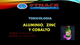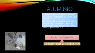 El documento habla sobre la toxicidad del aluminio. El aluminio se extrae de la bauxita y se usa ampliamente en la industria y la vida diaria. La exposición ocupacional al aluminio puede ocurrir a través de la inhalación de polvos y humos y puede causar fiebre de los humos metálicos o problemas pulmonares como la fibrosis. A largo plazo, la exposición al aluminio se ha relacionado con trastornos neurológicos como la enfermedad de Alzheimer. El reciclaje del aluminio ayuda a redu