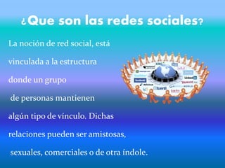 Las redes sociales son servicios en Internet que permiten a los usuarios crear perfiles y compartir información personal para establecer conexiones con otros que comparten intereses similares. Permiten mantener contactos de forma permanente y también son útiles para la búsqueda de empleo. Sin embargo, la publicación excesiva de datos personales puede comprometer la privacidad y seguridad del usuario, y el uso excesivo de las redes sociales puede afectar las relaciones familiares y sociales.