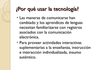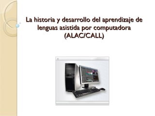 Este documento resume la historia y desarrollo del aprendizaje de lenguas asistido por computadora (ALAC/CALL). Explica que en las décadas de 1950 y 1960 se usaron computadoras centralizadas para actividades como exámenes de lenguas. Luego, en las décadas de 1970 y 1980, surgieron microcomputadoras que permitieron nuevas actividades interactivas centradas en el aprendiz. Finalmente, en los 1990s la tecnología LAN y Internet ampliaron las oportunidades de aprendizaje autónomo y comunicación entre apre