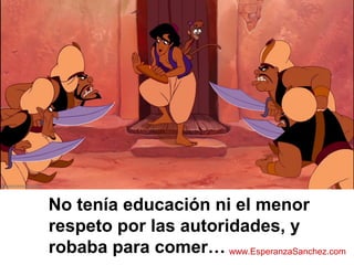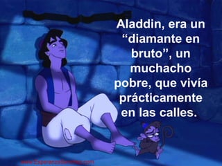 Aladdin era un pobre muchacho de las calles sin educación que robaba para comer. Fue el único capaz de abrir la cueva de las maravillas y encontrar la lámpara mágica, la cual lo convirtió en un príncipe y le permitió desplegar sus talentos ocultos, ganándose el afecto del sultán y el amor de su hija. Finalmente, se revela que Aladdin no era realmente un príncipe, sino que sus dones provenían de él mismo y solo necesitaba confiar en sí mismo para lograr grandes cosas.
