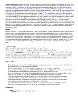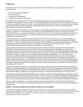 El documento describe la enfermedad del alcoholismo, incluyendo sus causas, síntomas, consecuencias y tratamientos. El alcoholismo es una enfermedad crónica y progresiva causada por factores genéticos y ambientales que genera dependencia física y pérdida de control sobre el consumo de alcohol. Sus efectos son dañinos para la salud física y mental de los individuos y la sociedad. El tratamiento busca la desintoxicación y rehabilitación a través de terapias conductuales y de grupo para mantener la abstinencia.