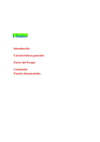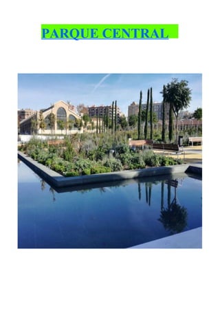 El documento describe las características y partes principales del Parque Central en Valencia. El parque fue diseñado por el arquitecto Demetrio Ribes y presenta jardines con diseños lineales y flora variada, así como estanques, plazas y áreas de mantenimiento. Las partes clave del parque incluyen la Plaza de Demetrio Ribes, el Jardín de la Huerta, el Jardín de las Flores y el Jardín Romántico.