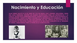Alan Turing (1912-1954) fue un matemático británico y pionero de la informática, conocido por desarrollar la 'máquina de Turing' y por su crucial papel en el desciframiento de los códigos de la máquina Enigma durante la Segunda Guerra Mundial. A pesar de sus hitos en computación e inteligencia artificial, enfrentó persecución por su orientación sexual, lo que llevó a su trágica muerte en 1954. Su legado perdura, siendo un símbolo de lucha contra la discriminación y un referente en la historia de la tecnología.