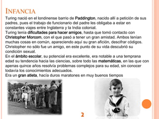Alan Turing fue un matemático y criptoanalista británico conocido por su trabajo en descifrar códigos durante la Segunda Guerra Mundial y por ser pionero en la computación e inteligencia artificial. Tuvo una infancia solitaria pero brillante académicamente. Trabajó descifrando códigos nazis en Bletchley Park y diseñó máquinas para romper el código Enigma. Después de la guerra continuó su trabajo pionero en computación e inteligencia artificial, pero fue condenado por homosexualidad y murió en circ