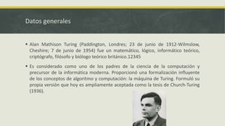 Alan Turing fue un matemático y criptógrafo británico que hizo contribuciones fundamentales a la ciencia de la computación y ayudó a descifrar los códigos de la máquina Enigma utilizada por los alemanes durante la Segunda Guerra Mundial. Trabajó en Bletchley Park descifrando mensajes enigmáticos con un equipo de matemáticos y logró crear una máquina llamada 'Christopher' que simulaba a Enigma y aceleró el proceso de descifrado. A pesar de su importante papel