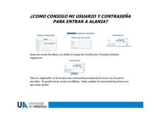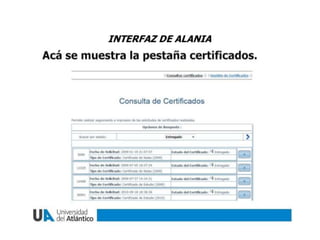 Alania es un sistema en línea que ofrece a los estudiantes de la Universidad del Atlántico una forma fácil y rápida de realizar solicitudes académicas y financieras, así como obtener certificados, a través de la página web de la universidad. Los estudiantes pueden ingresar a Alania haciendo clic en "Estudiantes" en la página principal y luego acceder a una interfaz que les permite realizar y dar seguimiento a sus solicitudes y certificados. La presentación sobre Alania se difundirá a través de