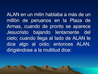 Jesucristo aparece durante un mitin de Alan García ante más de un millón de peruanos. Jesucristo le pregunta al pueblo si Alan les ha dado conocimiento como él, les ha prometido alimento y viviendas como él curó enfermedades, y fue traicionado como a Jesús lo traicionó Judas. El pueblo responde afirmativamente a todo con gritos de júbilo, hasta que Jesucristo les dice que crucifiquen a Alan, a lo que el pueblo responde eufóricamente.