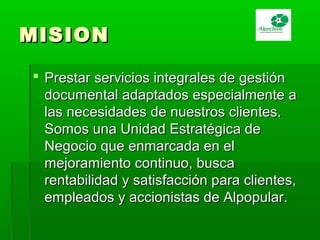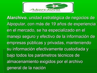 AlarchivoAlarchivo es una unidad estratégica de negocios de Alpopular con más de 19 años de experiencia en el manejo seguro y efectivo de la información de empresas. Ofrece servicios integrales de gestión documental como organización, microfilmación, almacenamiento físico y electrónico, y custodia de documentos y medios magnéticos para satisfacer las necesidades de sus clientes.