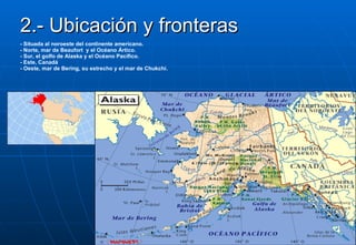 Alaska se ubica en el noroeste de América del Norte, limitando al norte con el Océano Ártico, al este con Canadá, al oeste con el mar de Bering y al sur con el Océano Pacífico. Tiene varias regiones como las Montañas del Pacífico y la Zona Ártica septentrional, y cuenta con más de 50 mil glaciares, 3 mil ríos y 3 millones de lagos. Su flora y fauna incluye bosques boreales, alces, osos, morsas, carneros y ballenas.
