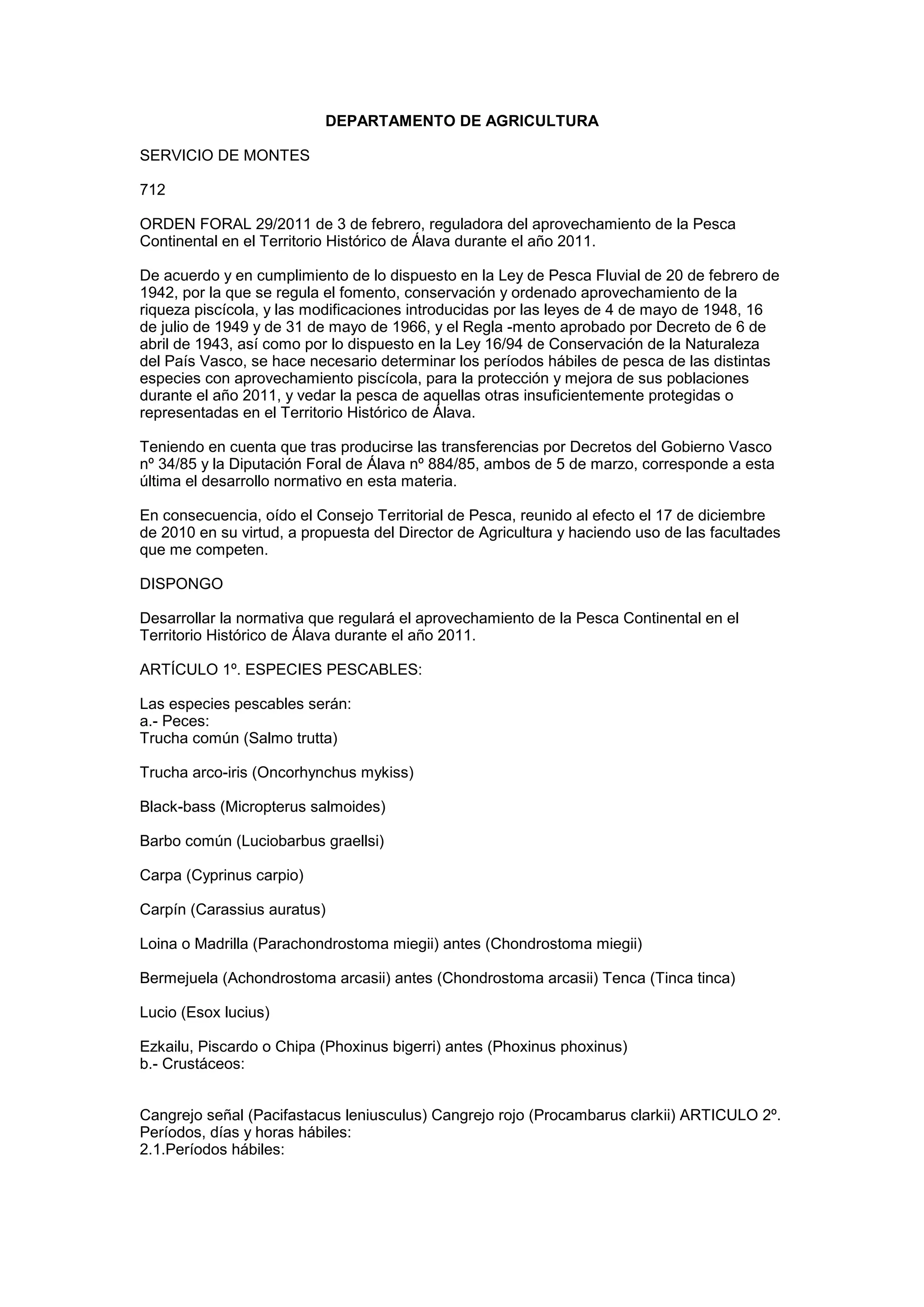Este documento establece las regulaciones para la pesca continental en el Territorio Histórico de Álava durante el año 2011. Define los períodos, días y horas hábiles de pesca, las especies autorizadas y sus tamaños mínimos, los artes y cebos permitidos, y las protecciones a la fauna piscícola.