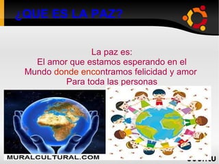 El documento trata sobre la paz y la guerra. Explica que la paz es el amor que se busca en el mundo para encontrar felicidad. El 30 de enero se eligió para conmemorar la muerte de Gandhi y crear conciencia sobre la paz. La guerra es un conflicto muy malo que debe superarse a través de la amistad. El símbolo de la paloma de la paz representa el mensaje de paz y amor.