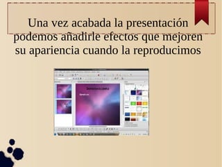 Seleccionar un diseño de diapositiva y formato para la presentación, luego agregar efectos que mejoren su apariencia al reproducirla, como transiciones entre diapositivas.