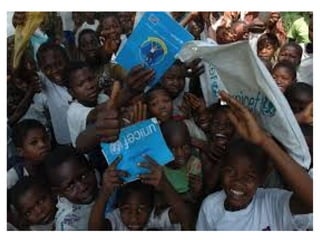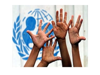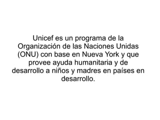 Unicef es un programa de las Naciones Unidas creado en 1946 para ayudar a los niños después de la Segunda Guerra Mundial. Actualmente provee ayuda humanitaria y de desarrollo a niños y madres en más de 190 países centrándose en supervivencia infantil, educación, VIH/SIDA, protección y políticas. Unicef también actúa en emergencias para salvar vidas de niños y está financiado por donaciones voluntarias.