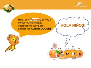 El documento habla sobre las propiedades y características de los albaricoques. Explica que los albaricoques crecen en árboles que pueden medir varios metros de altura y tienen flores blancas o rosadas. Contienen poca cantidad de calorías, gran cantidad de agua y alto contenido en fibra. Deben comprarse cuando tengan un color naranja dorado y una piel lisa y consistencia firme, pero no dura, y consumirse bien maduros para evitar dolor de estómago.