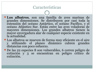 Los albatros son unas de las aves marinas más grandes, que se distribuyen por los océanos Antártico, Pacífico y Atlántico Sur. Se mueven de forma eficiente en el aire utilizando el planeo para cubrir grandes distancias con poco esfuerzo. Muchas de sus 22 especies se encuentran en peligro de extinción.
