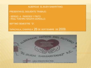 El documento describe el Albergue El Buen Samaritano en Tapachula, Chiapas. El albergue acoge a menores y les brinda educación, alimentación y apoyo psicológico con el objetivo de rehabilitarlos y darles un mejor futuro. El albergue cuenta con cinco habitaciones, comedor, cocina, biblioteca y áreas recreativas. Los estudiantes realizaron tareas de limpieza y aprendieron sobre la vida de los niños en el albergue.