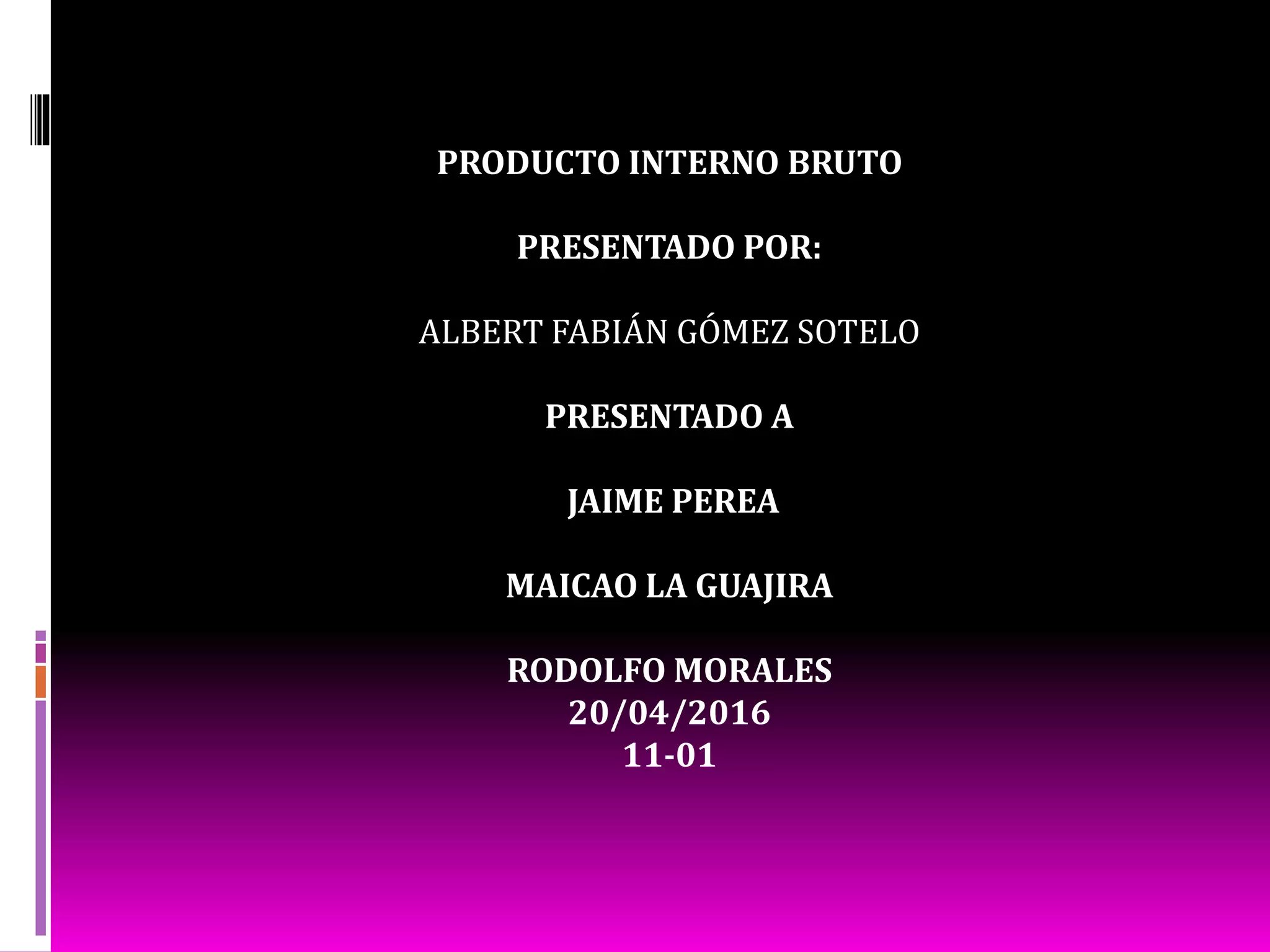 El documento resume el Producto Interno Bruto (PIB) de un país, incluyendo su definición como la suma del valor de todos los bienes y servicios finales producidos en un año. Explica los métodos para calcular el PIB, la diferencia entre PIB nominal y real, e incluye estadísticas sobre la inversión en infraestructura como proporción del PIB en Colombia.