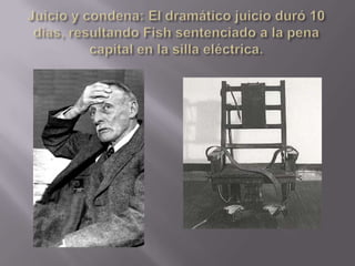 El documento describe el informe psiquiátrico de Albert Fish, un asesino en serie estadounidense. Fish sufría de múltiples trastornos como sadismo, masoquismo, pedofilia, exhibicionismo y canibalismo. Debido a su condición psicótica y gran cantidad de trastornos, Fish carecía de control sobre sus impulsos, lo que lo llevó a cometer numerosos crímenes atroces.