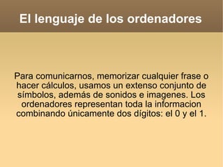 El documento describe los componentes básicos de hardware y software de un ordenador. Explica que la información se almacena en ceros y unos, y que el código ASCII se usa para representar caracteres. También describe la arquitectura básica de un ordenador, incluyendo el microprocesador, memoria RAM y ROM, y cómo se usa la memoria caché para mejorar el rendimiento.