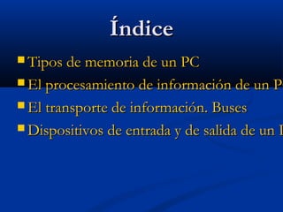 El documento describe los principales componentes de hardware de un PC, incluyendo los tipos de memoria (RAM, ROM, virtual), cómo procesa la información la CPU a través de la ALU, cómo se transporta la información a través de buses en serie o paralelo, y los dispositivos de entrada, salida y entrada/salida como el teclado, monitor, disco duro.