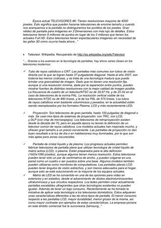 El documento describe la evolución de la televisión desde los años 70 hasta la actualidad. Ha pasado de ser el principal medio de comunicación masiva a competir con Internet. La televisión digital ha traído cambios tecnológicos como la televisión móvil, interactiva y bajo demanda que unen diferentes medios en un solo aparato multimedia.