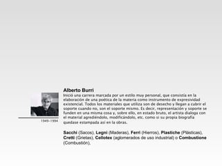 Alberto Burri inició una carrera artística muy personal que consistía en usar materiales de desecho como soporte o medio de expresión para representar su biografía. Utilizaba sacos, maderas, hierros, plásticos, grietas y aglomerados industriales que modificaba a través de procesos como quemarlos, para crear obras que dialogaban con los materiales de forma agresiva.