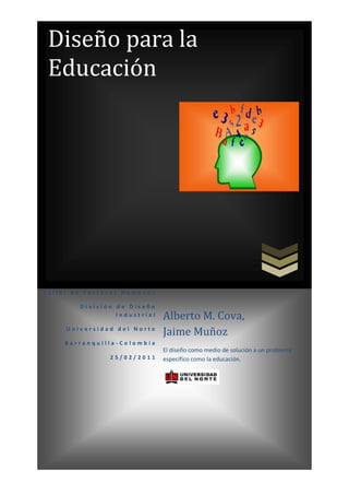 Este documento resume un taller sobre diseño para la educación impartido por Alberto Cova y Jaime Muñoz de la Universidad del Norte en Barranquilla, Colombia. El taller explora cómo el diseño puede ayudar a solucionar problemas en la educación, como la falta de concentración de los estudiantes. El documento revisa conceptos clave como tipos de educación, pedagogía, atención, interés, curiosidad y aprendizaje individual. El objetivo general es investigar la relación entre diseño y educación para encontrar posibles soluciones a problemas en este campo.