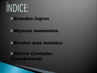 El documento habla sobre la carrera ciclística de Alberto Contador. Resalta sus logros como ganar el Giro de Italia, la Vuelta a España y etapas del Tour de Francia. También menciona sus mayores rivales y un caso de dopaje conocido como el "Affaire Contador" donde fue acusado de usar clembuterol aunque no se pudieron probar las acusaciones. Contador espera la resolución de este caso por parte de las autoridades del ciclismo.