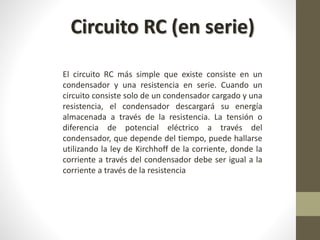 El documento describe conceptos relacionados con circuitos RC y respuestas de sistemas de control a diferentes tipos de señales de entrada. Explica el comportamiento de un circuito RC simple en serie y cómo calcular su voltaje a través del tiempo. Luego, cubre conceptos como la respuesta forzada a funciones senoidales, las especificaciones comunes para describir respuestas transitorias como tiempo de retardo, sobrepaso máximo y tiempo de establecimiento, y cómo definir errores y coeficientes estáticos para describir la precisión en el régimen permanente.