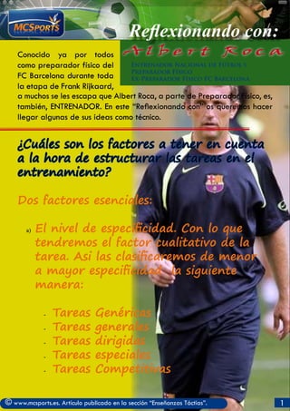 El documento resume las ideas del entrenador Albert Roca sobre la estructuración del entrenamiento y la táctica. Roca explica que los factores clave a considerar son el nivel de especificidad y la frecuencia cardiaca/tiempo. También discute el balance entre la táctica y la libertad de los jugadores, y cómo la organización defensiva facilita el progreso ofensivo.