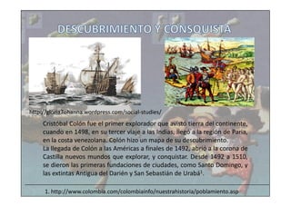 El documento presenta información sobre la historia de Colombia desde su descubrimiento y colonización por los españoles hasta eventos políticos y sociales importantes en los siglos XIX y XX. Entre otros temas, habla sobre la independencia de Colombia liderada por Simón Bolívar, la creación de la Gran Colombia, la guerra de los Mil Días, la constitución de 1886, el asesinato de Jorge Eliécer Gaitán y el surgimiento de grupos armados como el ELN.