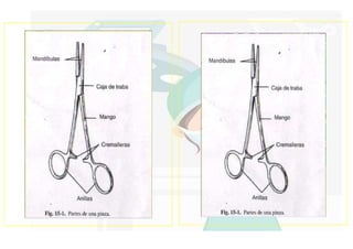 Este documento presenta una clasificación y descripción de diferentes tipos de pinzas quirúrgicas. Incluye pinzas para corte como tijeras quirúrgicas rectas y curvas, tijeras de Metzenbaum, tijeras de Potts y tijeras de Iris. También describe pinzas para hemostasia como pinzas Halstead, pinzas Kelly, pinzas Pean y pinzas Heiss. Finalmente, menciona otros tipos de pinzas como pinzas de Adson, pinzas Babcock y pinzas Foerster.