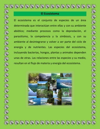 Un ecosistema consiste en las especies de un área que interactúan entre sí y con su ambiente a través de procesos como la depredación, el parasitismo y la competencia. Las especies dependen unas de otras y sus interacciones dan lugar al flujo de energía y materia en el ecosistema. Los ecosistemas pueden ser acuáticos, como mares y ríos, o terrestres y se desarrollan en la biosfera, donde los insectos, aves y mamíferos son los más numerosos. Los ecosistemas se us