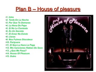 Los documentos presentan listas de canciones de varios álbumes de reggaetón y trap latino. El primer documento incluye canciones de los álbumes "Plan B - Love and Sex", "Plan B - House of pleasure" y canciones de Ñengo Flow. El segundo documento incluye canciones de los álbumes "Arcangel – Sentimiento elegancia y maldad" y "Farruko – Los Menores". Las listas incluyen el nombre de las canciones y en algunos casos los artistas invitados.