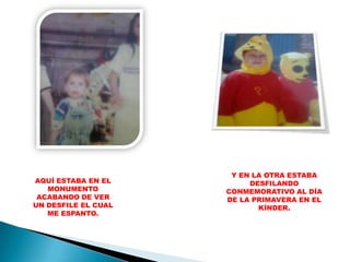 Este documento contiene varias imágenes de recuerdos de la persona a través de los años, incluyendo asistir a un desfile escolar, celebrar cumpleaños en el kínder y la primaria, ir a la playa en Acapulco con su familia, pasar el día en una alberca con amigos, elaborar un documental en un monumento, y tomarse una foto con una serpiente en el museo Vasconcelos.