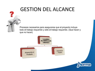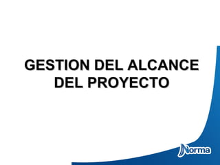Este documento describe los procesos de gestión del alcance de un proyecto, incluyendo la planificación del alcance, la definición del alcance, la verificación del alcance y el control del alcance. La gestión del alcance se enfoca en asegurar que el proyecto incluya todo el trabajo requerido y sólo el trabajo requerido mediante el uso de herramientas y técnicas apropiadas.
