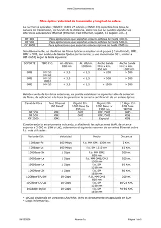 El documento describe tres tipos de canales de transmisión para fibra óptica basados en la distancia máxima soportada, así como cuatro tipos de fibra óptica clasificados según sus propiedades ópticas y mecánicas. También resume las variantes Ethernet más comunes soportadas por cada tipo de fibra y canal.