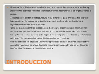 El documento define el alcance y los objetivos de una auditoría informática. El alcance establece los límites de la auditoría, incluyendo las funciones, materias y departamentos que serán auditados, así como las excepciones. Los objetivos deben ser claros para el auditor y el cliente, y deben incluir objetivos generales como mantener la operatividad de los sistemas y controles de gestión informática. La indefinición del alcance puede comprometer el éxito de la auditoría.