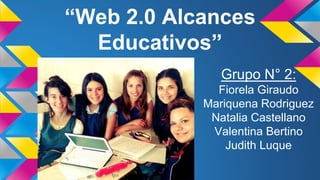 El documento habla sobre los alcances educativos de la Web 2.0. La Web 2.0 se basa en contenidos compartidos y producidos por los usuarios, y promueve que la organización y flujo de información dependan del comportamiento de las personas que acceden a ella. La Web 2.0 permite buscar, copiar, compartir e interactuar en línea para producir conocimiento de forma colaborativa. Esto ofrece un espacio rico en información con nuevos roles para docentes y alumnos y mayor participación e interés de los alumnos, junto con nue
