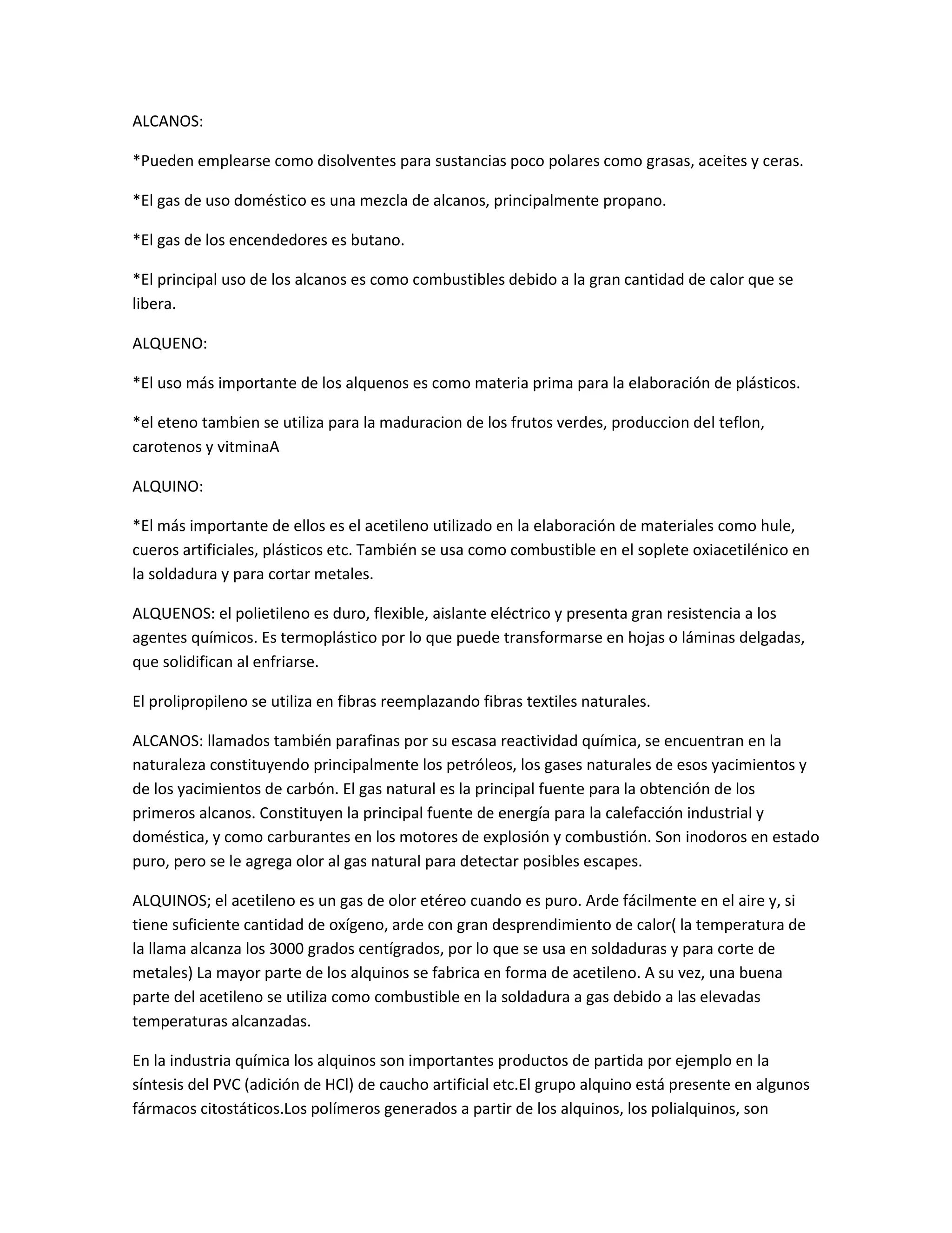 El documento resume las propiedades y usos principales de los hidrocarburos alcanos, alquenos y alquinos. Los alcanos se usan como disolventes y combustibles debido a que liberan gran cantidad de calor. Los alquenos son importantes para fabricar plásticos y madurar frutos. El acetileno es utilizado para soldadura oxiacetilénica y en la síntesis de materiales.