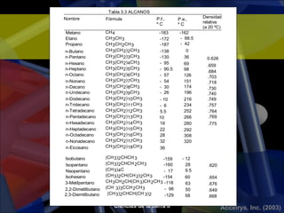 Los alcanos son hidrocarburos formados por carbono e hidrógeno que se caracterizan por tener enlaces covalentes simples. Son los principales componentes del petróleo y se clasifican según su fórmula general CnH2n+2. Los alcanos de cadena corta son gases o líquidos volátiles y los de cadena larga son sólidos a temperatura ambiente. Se usan como fuentes de energía, solventes y en la industria petroquímica.