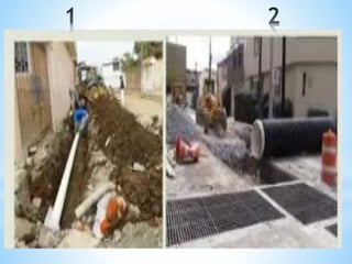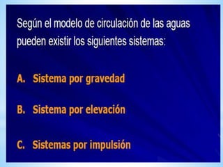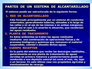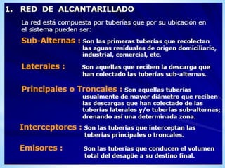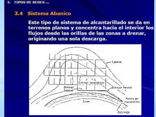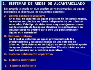 El documento describe diferentes tipos de sistemas de alcantarillado. Define aguas grises y aguas negras. Explica que el alcantarillado es un sistema de tuberías para recolectar y transportar aguas residuales y lluvia. Se clasifican los sistemas en alcantarillado sanitario, pluvial y combinado. También describe sistemas no convencionales como alcantarillado simplificado, con domínales y sin arrastre de sólidos.