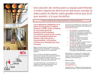 Este documento presenta una propuesta para un conjunto de habilidades de capacitación para asesores financieros, directores y capacitadores. El curso de habilidades de ventas de 5 días o 1 día ayudará a los equipos de ventas a mejorar sus habilidades de escucha activa, análisis de necesidades de clientes y construcción de relaciones para lograr mejores resultados de ventas. Varias empresas han experimentado un aumento en las ventas después de que su personal complete el curso.
